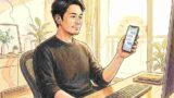 [画像挿入](机の上:書類・スマホ・PCの写真)